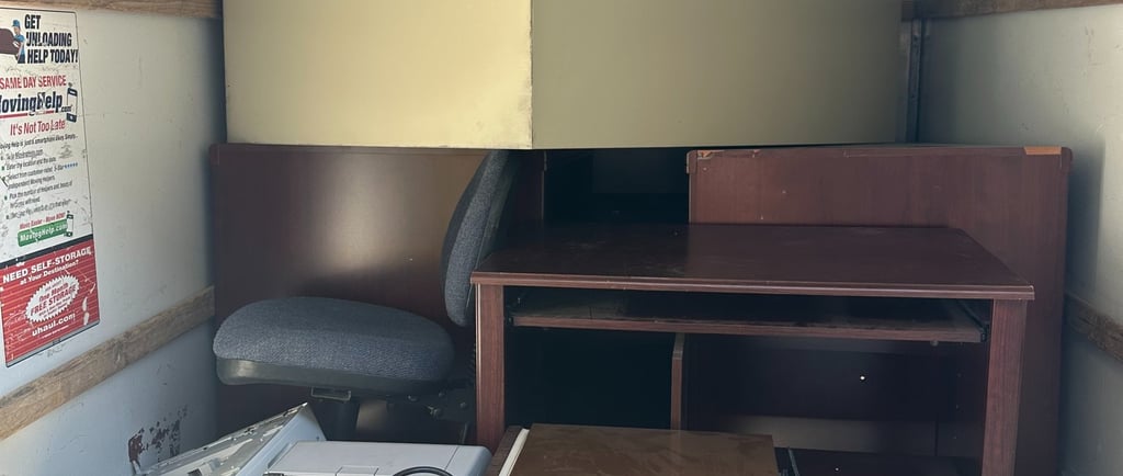 Commercial office cleanout in Hollister, CA removing desks, chairs, cabinets, and electronics. Junk Stars handled hauling and relocation with care.